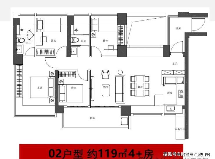 118m²(4+1)户型,带入户,以横厅设计,私密度更强,白色位置为设备阳台,也是赠送空间,主卧也是L型大飘窗设计,主朝向为南,整个户型可以做到南北对流,几乎无对视,改善客户可以考虑。