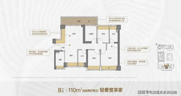 B户型-约110㎡4房2厅2卫:户型分布在1、2单元,竖厅南北通透格局。
