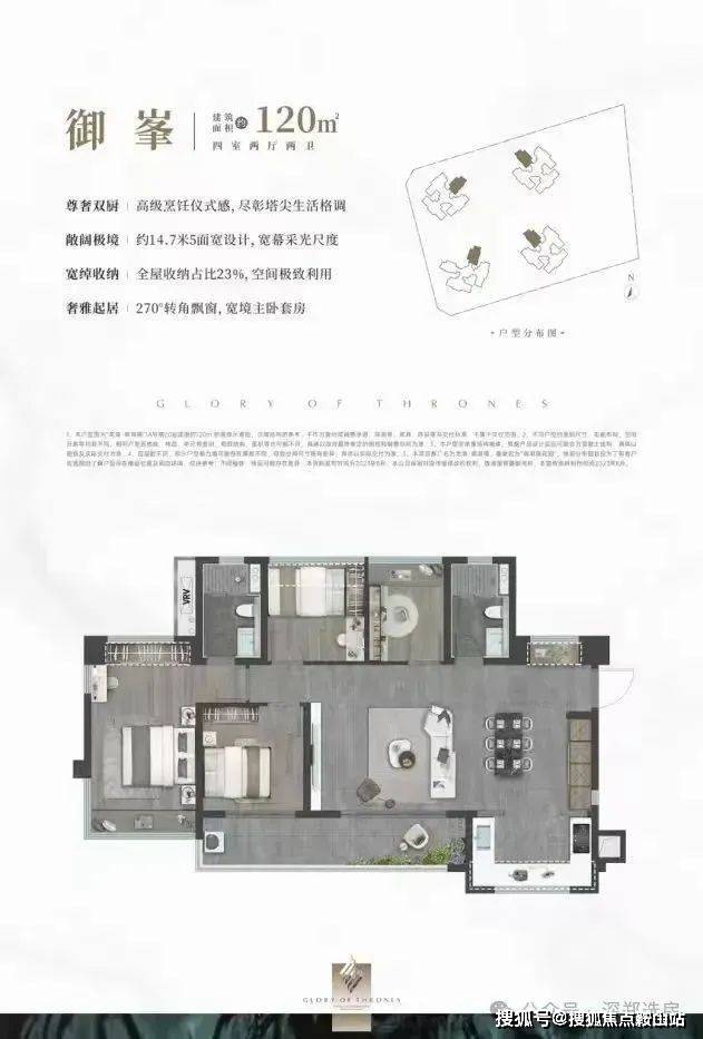 设计的是横厅南北通透格局,客餐厅开间8米,约14.7米超幕视野,超长阳台,主卧转角270°大飘窗,U型厨房,得房率:78.99%(不含赠送),阳台主朝西南或东南向。