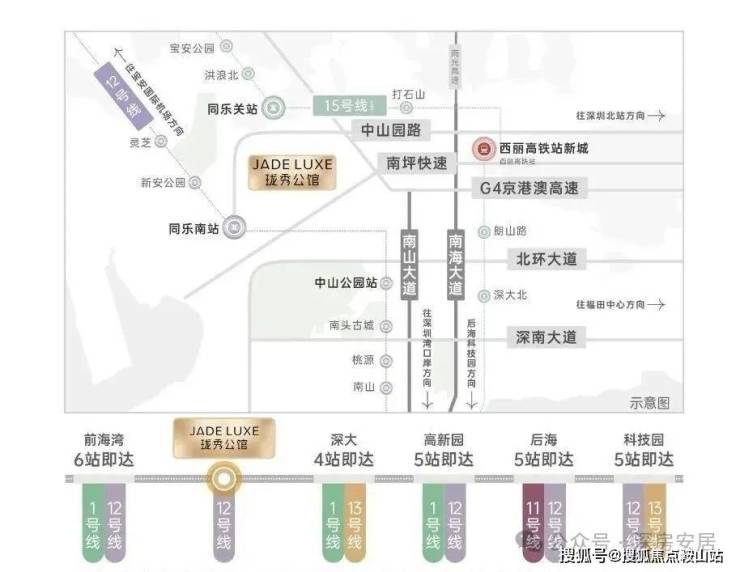• 15号线同乐关站(在建中,预计2028年12月开通),串联宝中/前海/深圳湾/西丽,也被称为深圳“一环线”,本项目为环线上的重要一环;