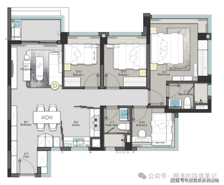而雍云邸的做法,则是利用主卧的飘窗与飘窗实现对流,巧妙避开了卫生间,舒适性更强。