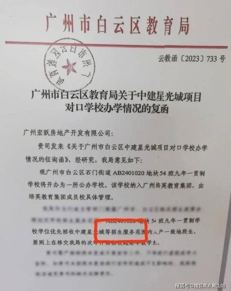 有些朋友可能会了解过这边,特别是了解过中建星光城的朋友,那边的销售会说学校优先他们的业主入读,还会给你看以下的文件,但其实不是的,他们跟你玩起了文字游戏,大家重点看圈起的文字:等招生服务范围,还是人户一致优先为主