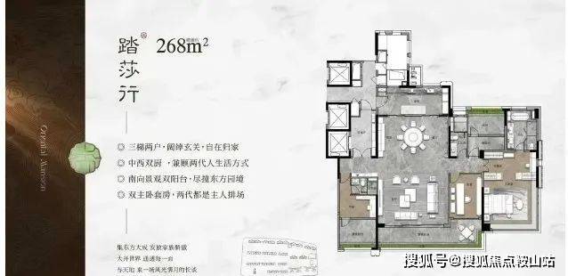 :LDKG 一体化大阔厅,双主套设计,近 11.5 米南向阳台,适合多代同堂且追求高品质生活的家庭。