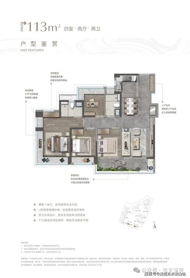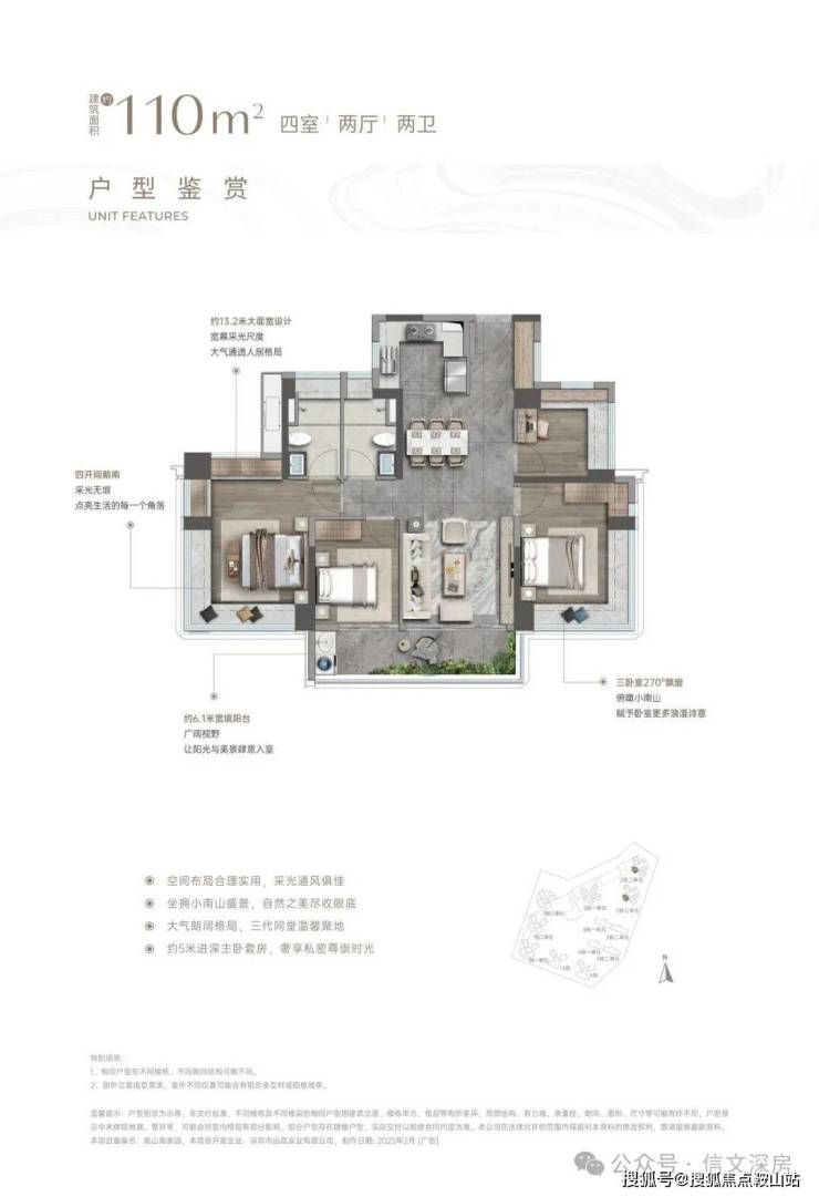 户型亮点:LDKB一体化竖厅设计,3.5米客厅开间,空间通透流畅。S墙设计预留冰箱卡槽,优化厨房收纳;U型厨房动线高效,洗切炒一气呵成。空间细节:三卧室面宽分别达3.6米、2.8米、2.8米,主卧与一次卧带270°全景飘窗,延伸观景视野。6.3米长阳台连接客厅与次卧,一半用于晾晒,一半可打造休闲角。适配人群:新婚夫妇、年轻三口之家,以可控总价享受南山三房,兼顾自住与保值。📐 110㎡ 四房两厅两卫|横厅改善之选