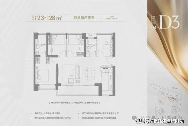 123-128㎡的4房2厅2卫,设计的是横厅南北通透格局,进门入户玄关,客餐厅6.6米开间,LDKB一体化设计,四开间朝南,主卧套房设计,6.6米超长观景阳台,U型厨房,卫生间干湿分离,得房率约72.45%(不含赠送),阳台主朝正南向。