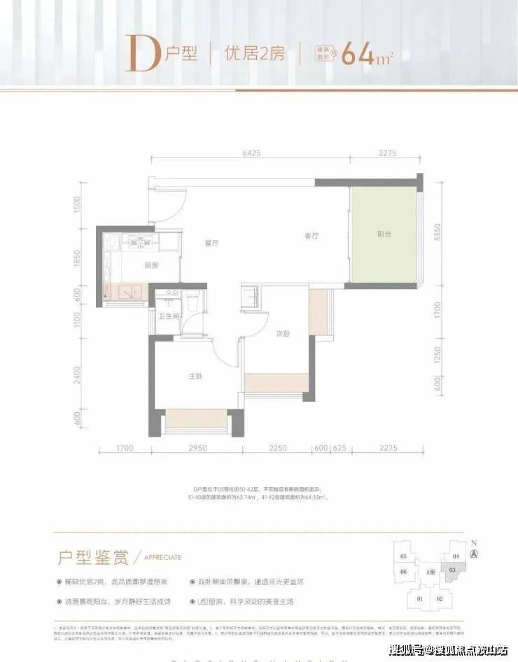 64㎡的2房2厅1卫,仅1栋A座03户型才有,设计的是竖厅格局,LDKB一体化,双卧室朝南向,次卧双飘窗设计,U型厨房,卫生间干湿分离,朝正西向。