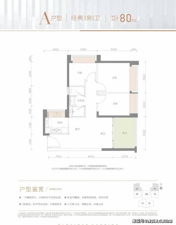 80㎡的3房2厅1卫,1栋A座04.05户型,设计的是竖厅格局,LDKB一体化,动静分区,次卧双飘窗设计,U型厨房,创新式三分离卫生间,朝正西向或正东向。