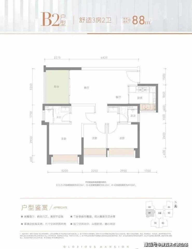 88㎡的3房2厅2卫,仅1栋A座06户型才有,设计的是竖厅格局,LDKB一体化,动静分区,三个卧室都朝南向,U型厨房,公卫三段式分离,正东朝向。