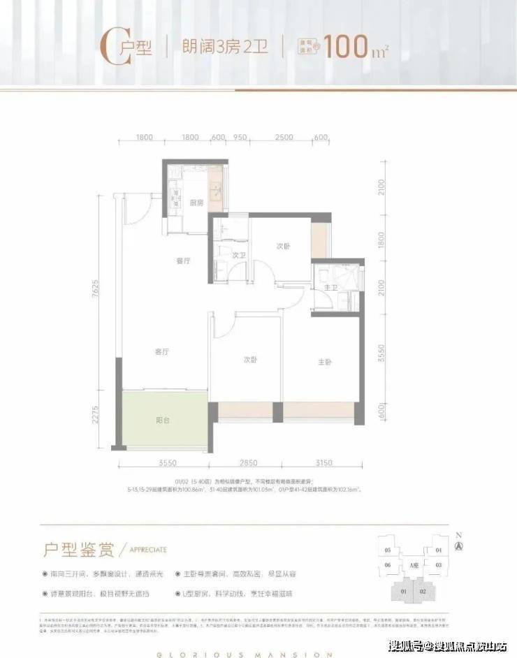 100㎡的3房2厅2卫,1栋A座01.02户型,设计的是竖厅格局,LDKB一体化,动静分区,三开间朝南,U型厨房,卫生间干湿分离,正南朝向。