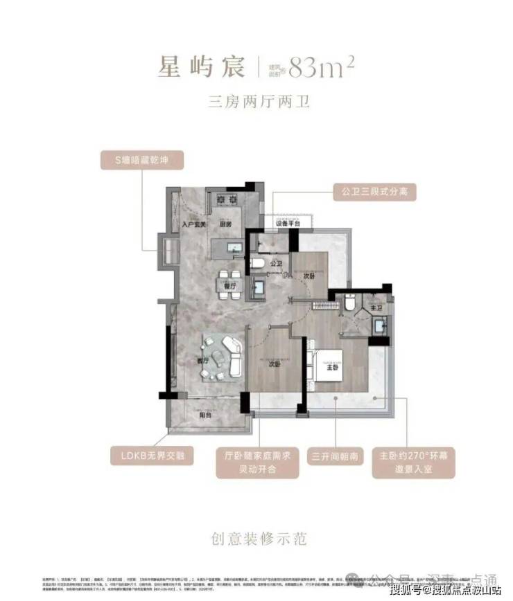 83㎡的3房2卫,折后总价299-320万/套,单价3.63-3.88万/㎡。