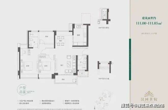 111㎡的3房2厅2卫,设计的是竖厅南北通透格局,客厅3.9米开间,四开间朝南,3个卧室分别做到了3.3米/2.8米/2.8米的宽度,U型厨房,得房率:75.16%(不含赠送),阳台主朝东南向