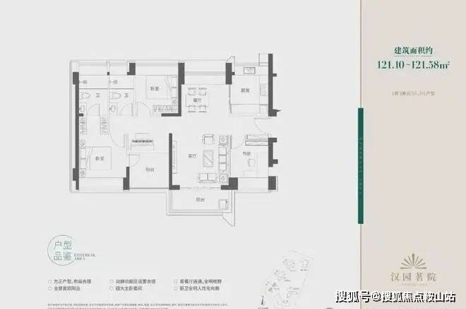 121㎡的4房2厅2卫,设计的是竖厅南北通透格局,客厅3.9米开间,四开间朝南,4个卧室分别做到了3.3米/3米/2.8米/2.6米的宽度,主卧大套间设计,U型厨房,得房率:73.12%(不含赠送),阳台主朝东南向