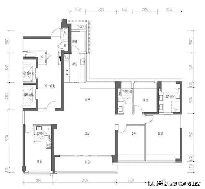 169㎡户型:4房2厅3卫,竖厅格局,2梯2户,专梯入户,得房率约68.58%(不含赠送),正南朝向。