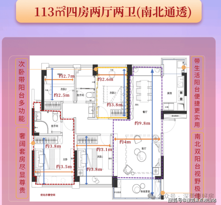 3、户型:建筑面积约113㎡四房两厅两卫,稀缺南北通透,三阳台设计,约4米阔景大阳台