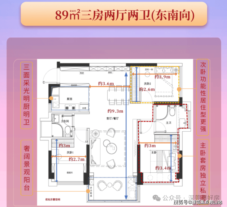 2、户型:建筑面积约89㎡三房两厅两卫,东南朝向,双阳台,主卧套房设计