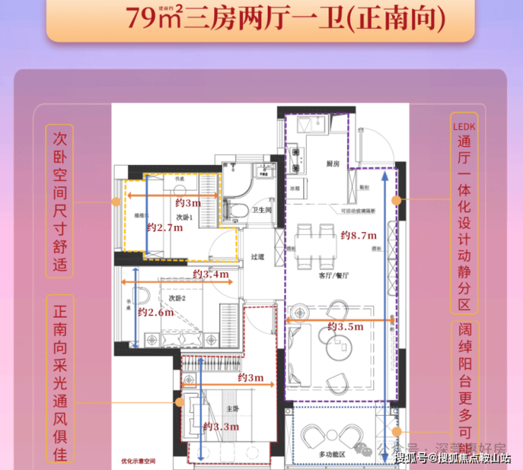 1、户型:建筑面积约78-79㎡极致三房两厅一卫,稀缺高性价比三房