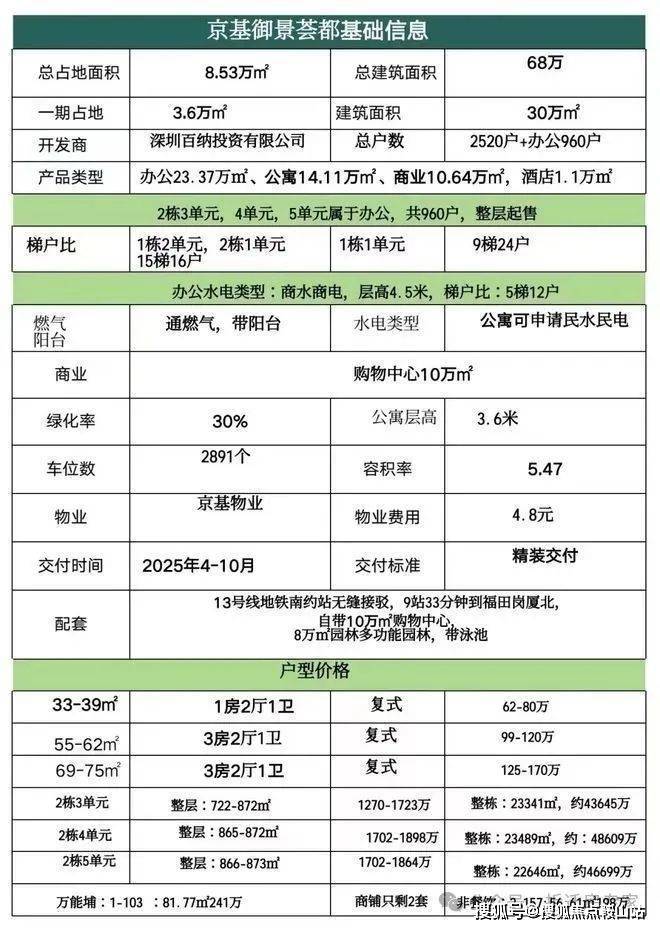 京基御景荟都分三期开发,一期是由4栋总层42-44层的公寓和3栋办公组成,一期建面30万㎡,二期三期是由学校,酒店,办公,公寓组成。目前在售一期产品