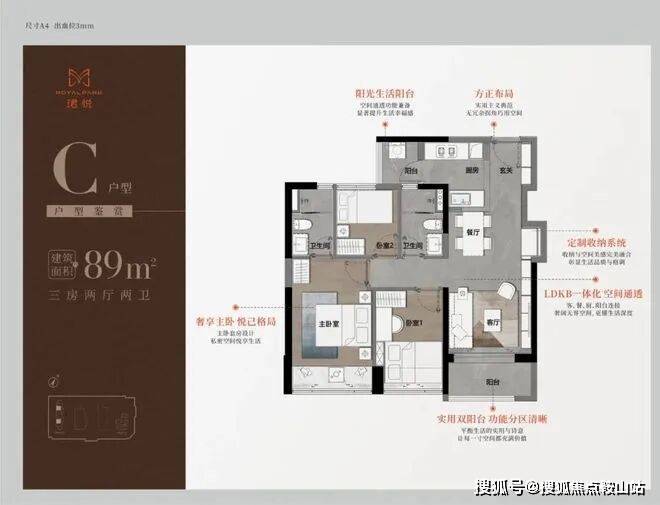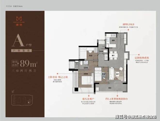 89㎡三房二卫A/B户型,位于1栋一单元,两开间阳台,主卧都有双面凸窗赠送。