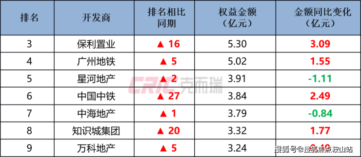 TOP30 “金字塔式”分化,除了双雄领跑,第二梯队的竞争同样精彩,TOP10房企里面有7家房企排名同比上升,保利置业、中国中铁、知识城集团排名上升亮眼。其中,保利置业排名大幅上升16位跃居权益榜第三,销售金额同比增加3.09亿元,增长最为显著,近六成业绩来自荔湾白鹅潭广州·保利翡丽甲第;广州地铁地产依托TOD开发优势以5.02亿元位列第四;其它房企销售金额集中在3亿—4亿元,业绩差距较小。