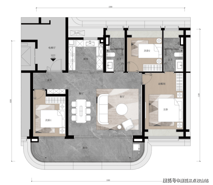 149㎡三房,独梯入户,南向三开间,采光面约13米,大横厅面宽约9.5米,卧室一间在玄关处,另外两间位于里侧,主卧套房带衣帽间+主卫。