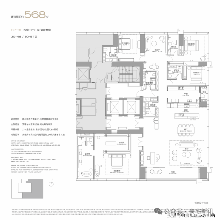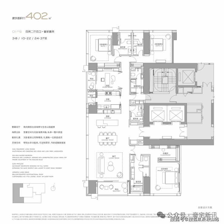 面积设计:300、400、460、570、1000平米纯粹大户型,空间方正,极致私密。