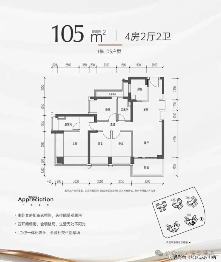 本批次产品中最大面积户型,位于1栋,东南朝向最前排,一共两条腿。观景阳台约2.1米宽,加上三个卧室一共四开间推窗即是观澜河、碧道公园、大布巷历史文化公园景观,视野开阔无遮挡,居住感受好。