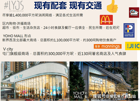 周边配套:项目附近有购物中心满足生活所需,同时拥有两家大型商场YOHO MALL形点,总面积约110万平方呎和V city面积约30万平方呎,构成消费网络满足各式生活所需