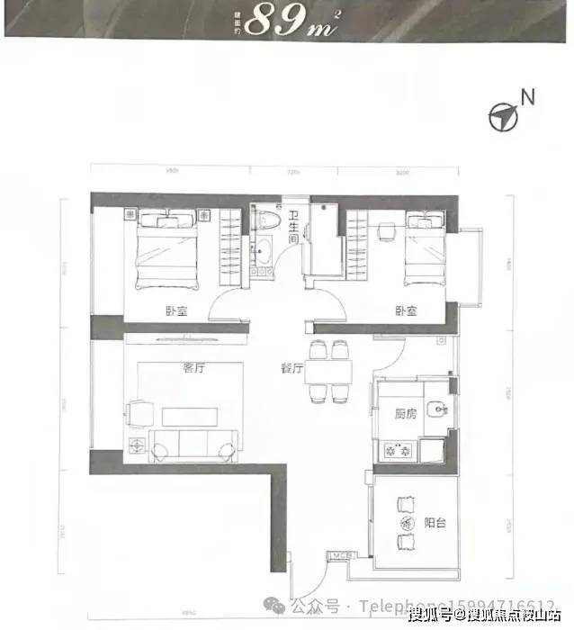 建面约89㎡三房:紧凑实用,功能区域划分明确,满足三口之家的居住需求。