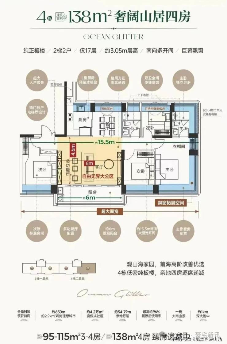 这次推出的138㎡为小区楼王3/4栋,17层2梯2户板楼,带独立电梯厅,可以做5房,赠送后得房率去到94-97%,预计单价10万/㎡左右,总价1300万左右。