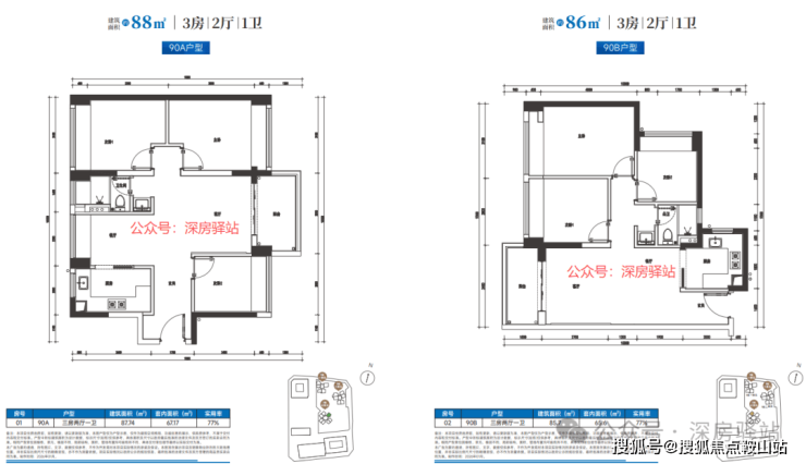 三房户型51套,建筑面积约86-88平方米。