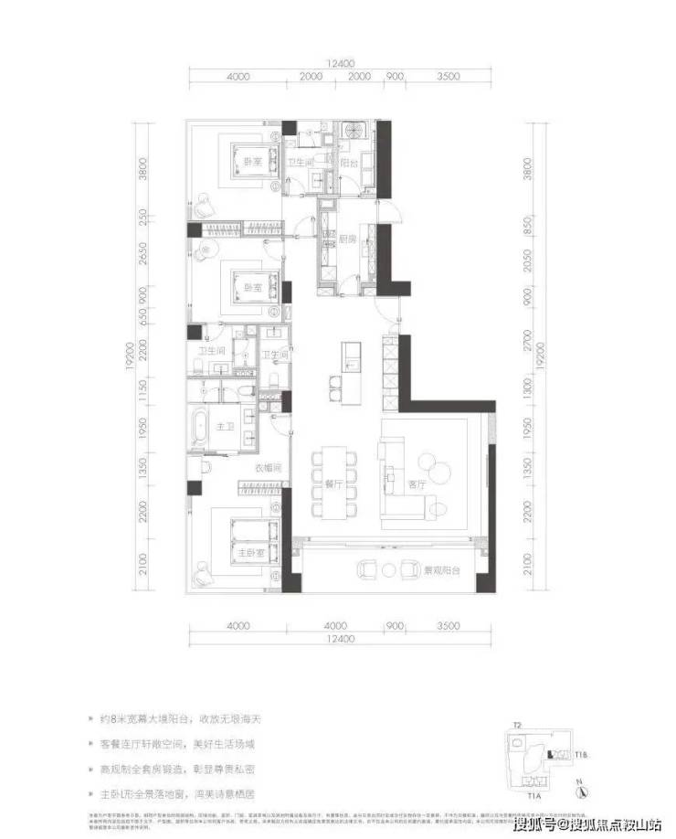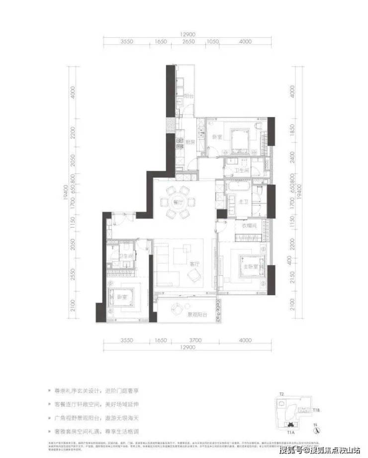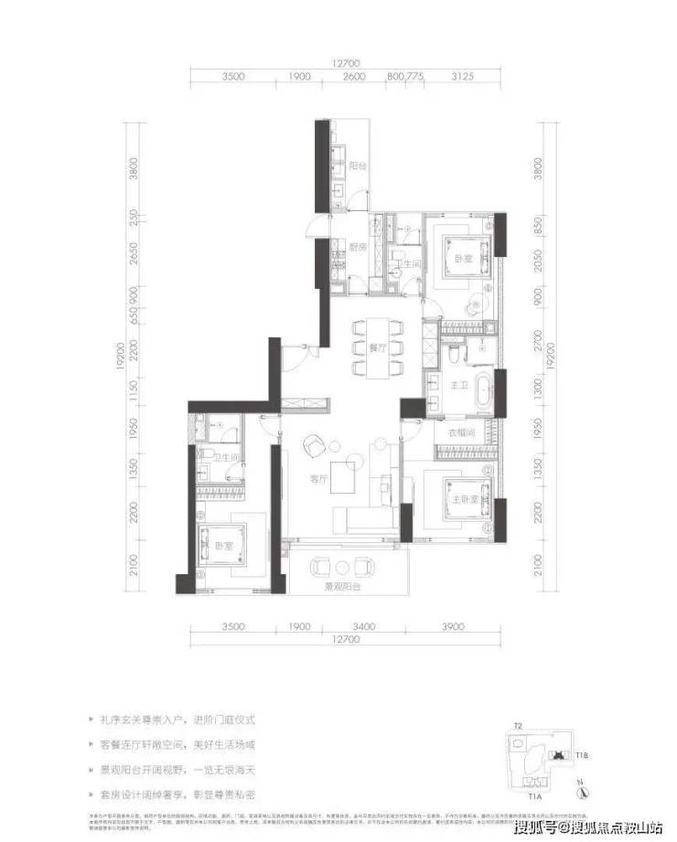 T1a栋F户型格局感觉是T1A栋D户型的削弱版,尺度更小,东西向面宽缩短,减少了一个房间。相同的景观面,但该户型楼层更高。