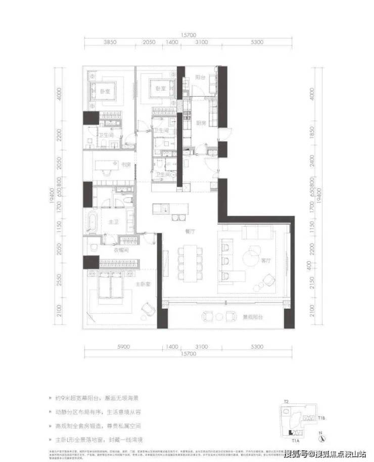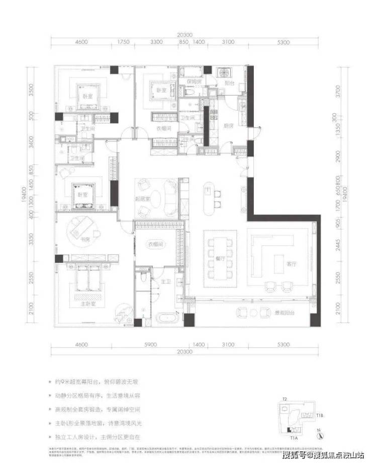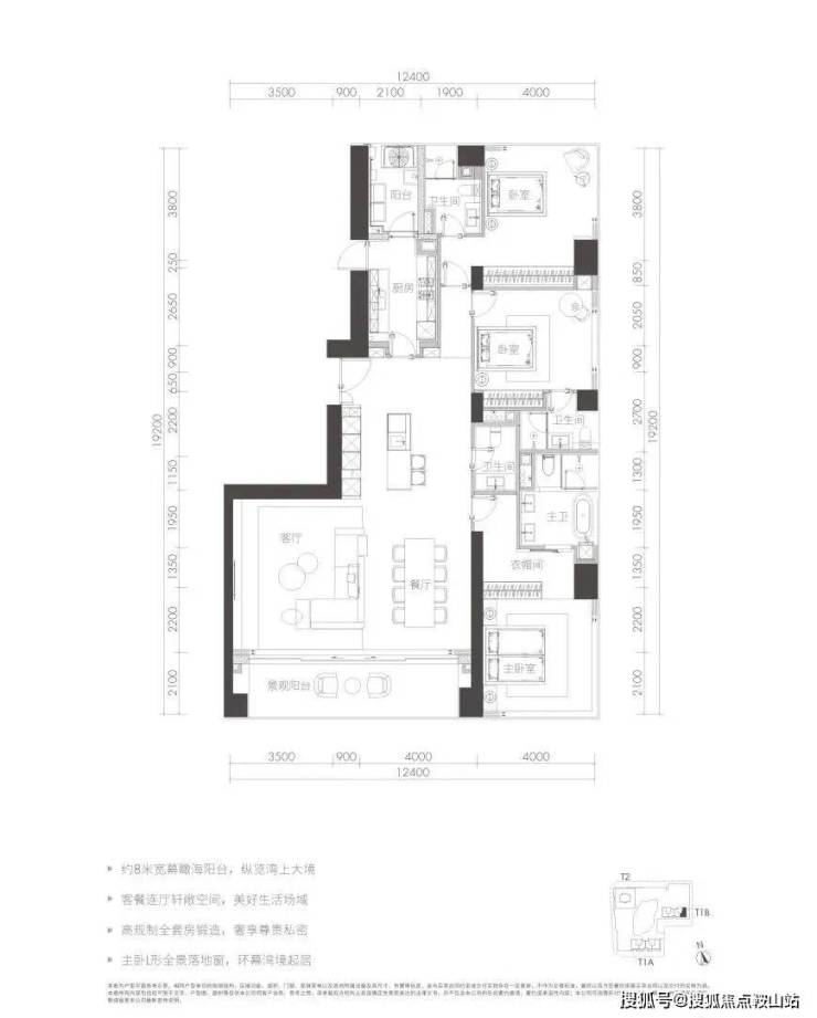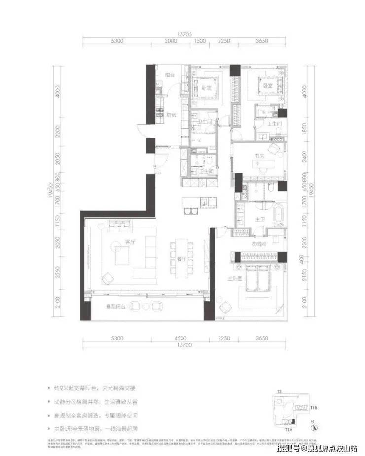 整个项目的楼王单位,只存在于高区33-38楼,极为稀缺。户型格局相当于T1a栋A户型的加强版,楼层更高,尺度更大,功能性更全面;增加了保姆间、起居室等空间,近80㎡的至尊主卧配备独立书房;起居室估计得开灯。