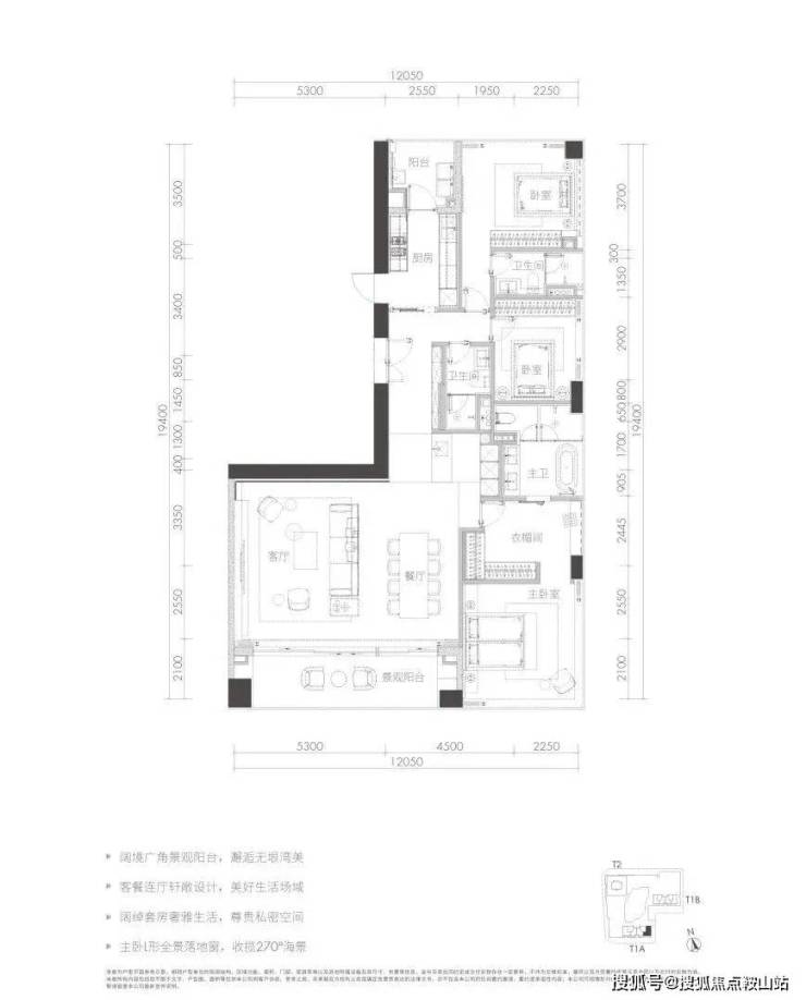 T1b栋D与T1a栋F户型格局相似,但是终于把“中央公卫”去掉了,换成吧台,明显协调了许多。东端头无遮挡,270°景观,适合看日出。