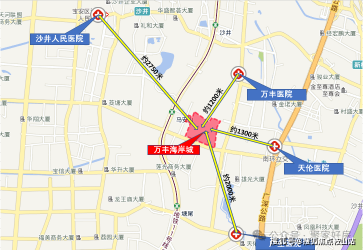医疗:项目1公里范围内分布有马鞍山社康,万丰社区社康,除此之外距离项目较近的两所医院是万丰医院和深圳天伦医院,日常小的身体不适可就近就医相对便利。离项目最近的大型公立医院是沙井人民医院,距离项目直线距离约2.75公里,距离稍远,缺少一定便利性,医疗借助交通工具通行。