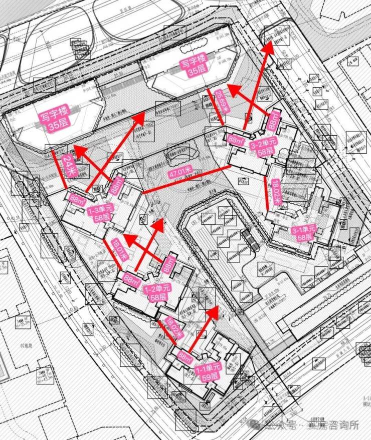 还有这里需要注意的一点是楼间距问题,其中每栋楼的竖向间距只有18-24米,主要影响比较大的是88的户型,不过这个户型得房率也会做的比较高南北通透的户型,再就是住宅横向楼间距大概在47米算中规中矩