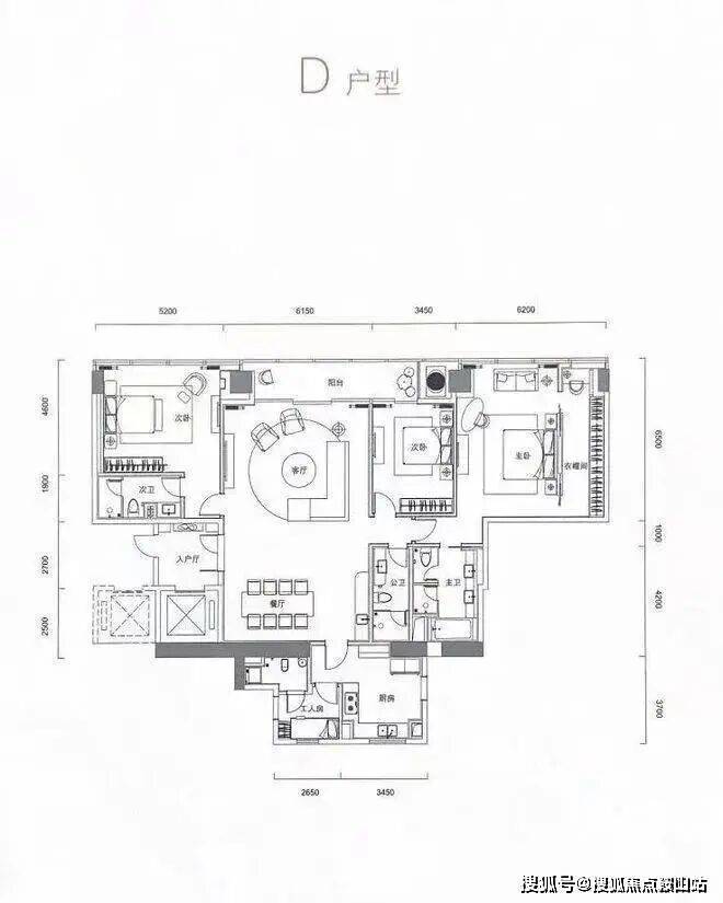 A、B户型,整体是做了动静分离的设计,客餐厅一体化有100平方,中西餐厨设计,有四个套房五卫+1个保姆套房+书房。270° 环幕主卧+全景落地采光玻璃,给你视觉冲击,独立的衣帽间以及一个三分离主卫,也是特别的奢侈。除此之外朝南三开间自西向东分别是老人房,次卧。老人房和次卧都做了全明飘窗,还有一个干湿分离的卫生间,入门一排衣柜。