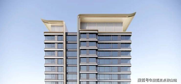 屋顶曲线飞檐,配以高级灰风尚立面+香槟色铝板格栅的艺术配色