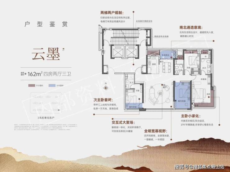 建面约162㎡四房两厅三卫,南北通透,餐客厨一体,四开间朝南,双套房设计,主卧小家化。