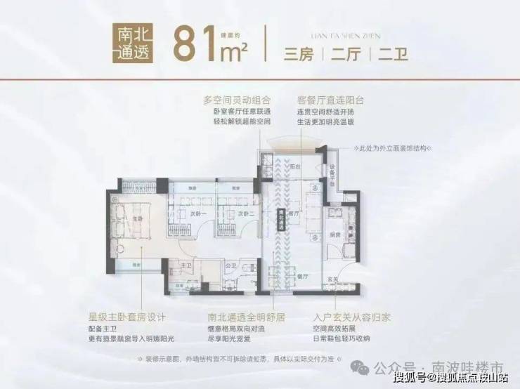 81㎡户型特点:竖厅南北通透格局,客厅开间3.4米,卧室宽度分别为3米、2.6米、2.2米,L型厨房设计,阳台为西北或东北朝向。