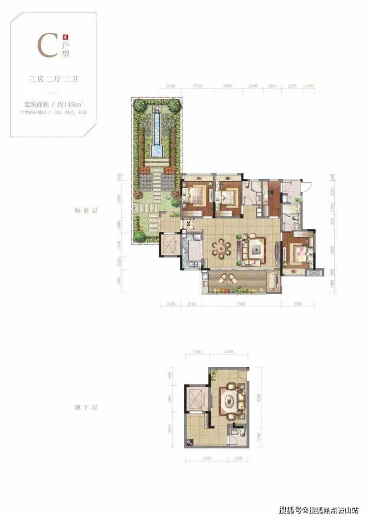 C户型位于每一栋洋房的三楼或4楼建筑面积149平米,实际使用面积219-239平米,花园送了30-50平米,地下室送了40平米。