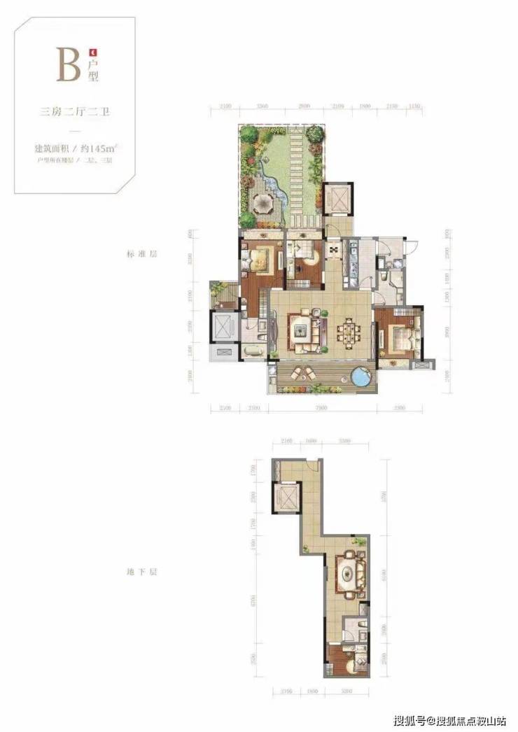 B户型:位于每一栋洋房的2楼建筑面积145平米,实际使用面积232平米,花园送了45平米,地下室送了42平米,送一个车位。