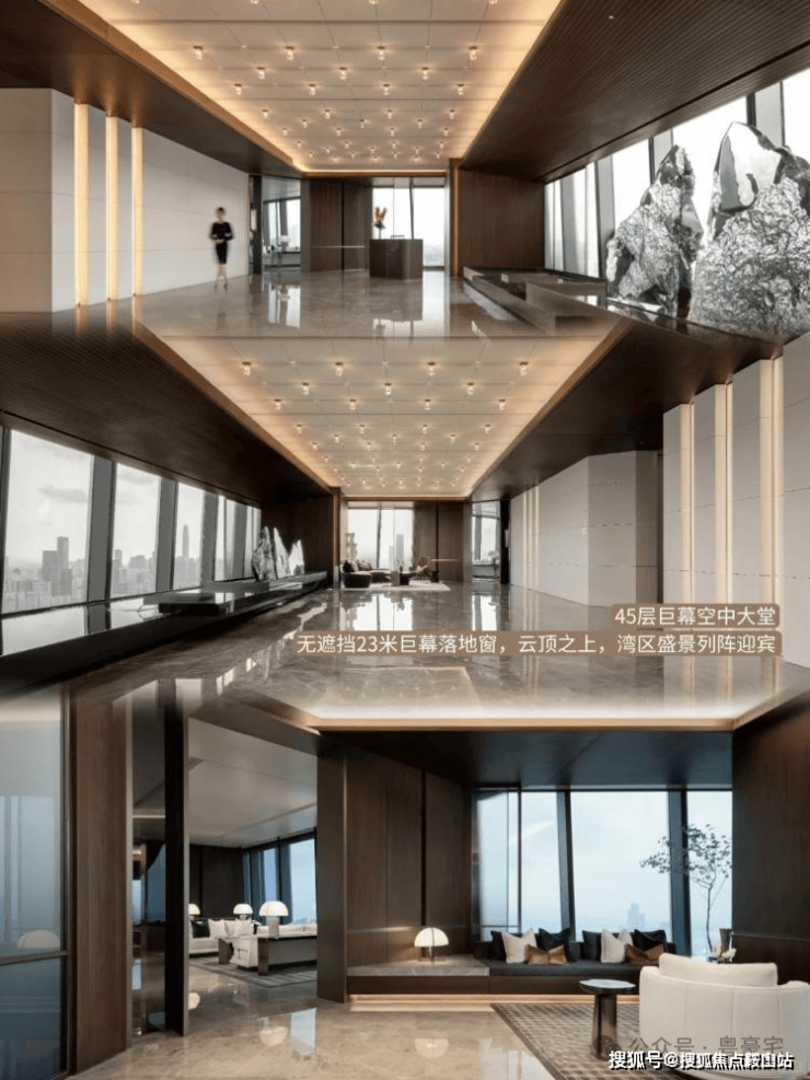 ◆巨幕宽幅 全景视野 ◆将100块玻璃置于阳光下对比试验只为挑选最融合天际的幕墙色彩2m超宽幅玻璃,匹配亚麻纹理不锈钢窗框 兑现天际极致视野,勾勒划时代美学
