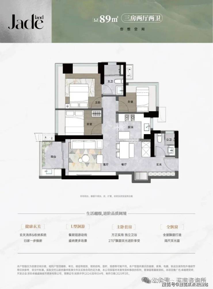 3栋89㎡的3房2厅2卫,设计的是经典竖厅格局,进门入户玄关,LDKB一体化,S墙设计预留冰箱卡槽位,三开间朝南,主卧+1个次卧270度飘窗,L型灵动式厨房,卫生间干湿分离,得房率约92%(包含赠送),西南或东南朝向。🎇卓越珺奕府售楼处电话:400-805-9003【售楼处电话已认证】