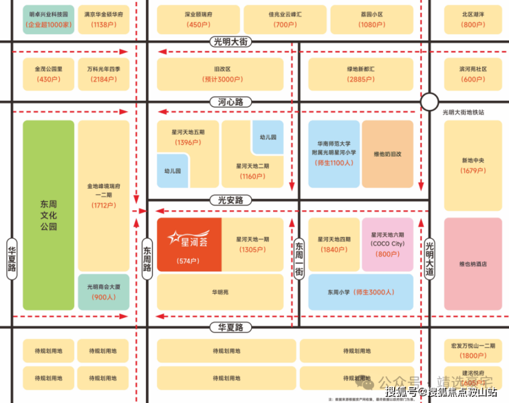 星河天地分为6期开发,建面80万方,共计7000户,总计约30000人,800米内金地峰境瑞府、新地中央、绿地新都汇、金茂公园里、万科光年四季、佳兆业云峰汇、深业颐瑞府、宏发万悦山、学校、园区等消费客群超5万人。