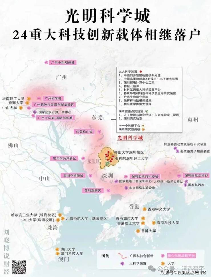 入驻创新载体:24项重大科技创新载体相继落户光明,包括九大科学装置、两所省重点实验室、十一个科研平台