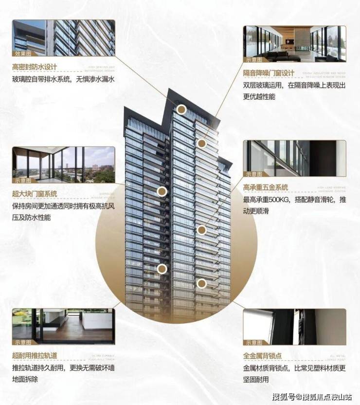 · 公建化轻奢立面:国际化时尚轻奢立面,富有质感,更显档次和品质。甄选造价高于普通玻璃3倍的双层low-e玻璃,采用拥有更强隔音降噪、隔热节能和防风防雨效果的格鲁斯系统门窗,具备更通透的视野和更高的安全性,约47%超高窗地比,270°为生活照进无限光芒。予业主高品质居住体验。