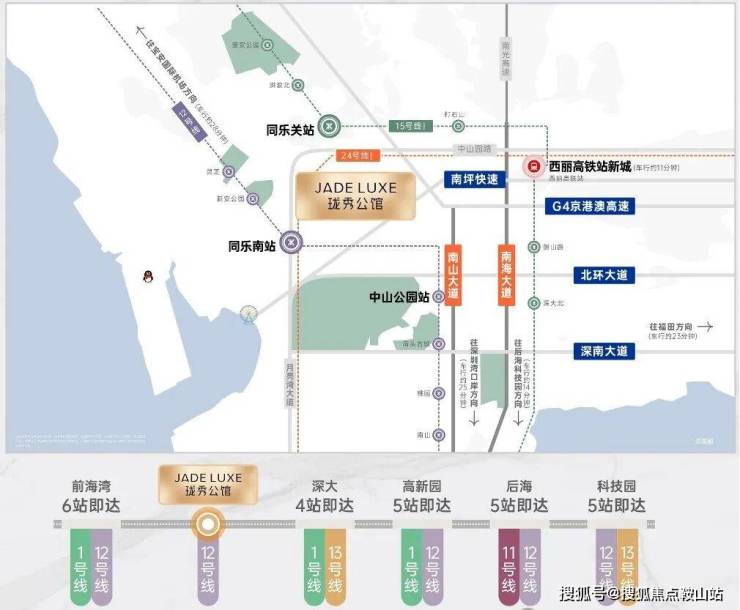 西丽高铁站新城(在建,直线约 2.3km,2028 年通车)、宝安国际机场、深圳湾口岸(前海口岸规划中),海陆空轨无缝衔接。