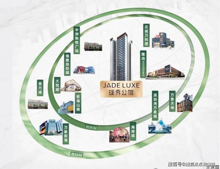 约 3-5KM 内:南山前海山姆、云城万科里、万象前海、万象天地、海岸城、深圳湾万象城,及宝中海雅缤纷城、大悦城等高端商业;