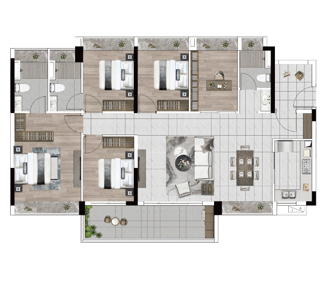 建面140㎡左右的5+1户型是双套房设计,不仅满足了三胎、三代同堂的需求,还可以多出一个灵活使用的空间, 当前市面上相同户型的顶尖。