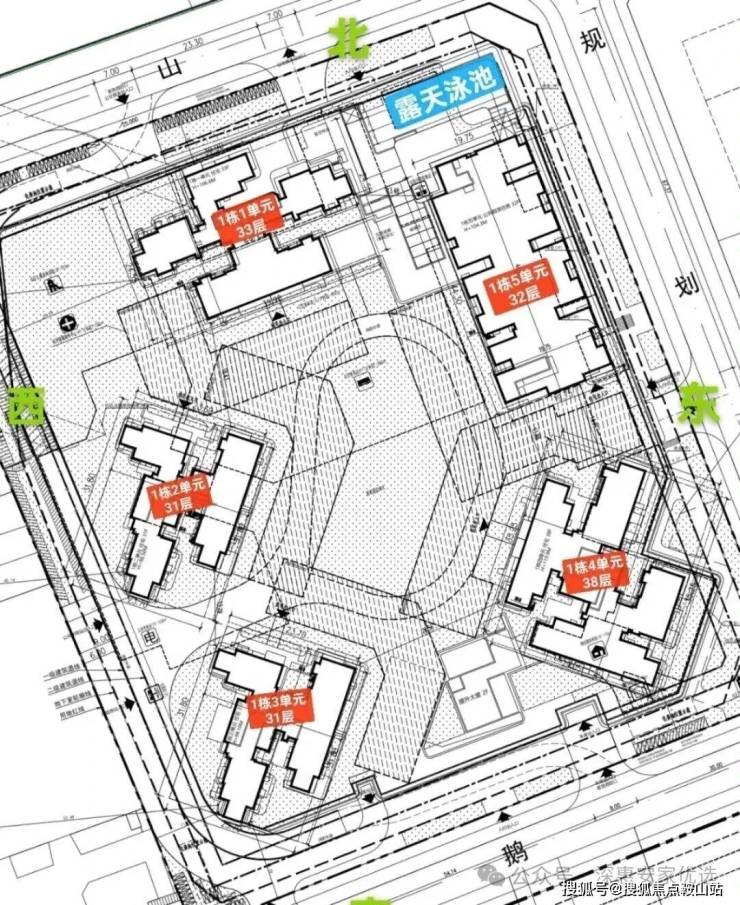 共由5栋总高31-38层的住宅组成,其中1栋1单元住宅33F,1栋2/3单元住宅31F,1栋4单元住宅38F,1栋5单元公租房32F,小区地下车库配建有公交首末站。